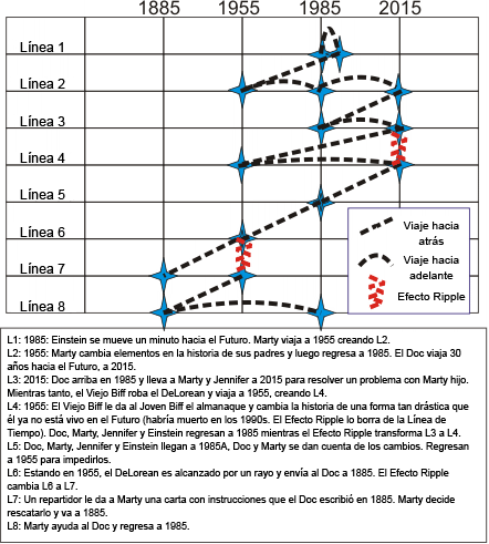 En el gráfico podemos ver que laLínea de tiempo 1 es la línea de tiempo original. Los desplazamientos hacia el Futuro no crean nuevas líneas de tiempo. El viaje de Marty al pasado en 1955 crea la Línea de Tiempo 2. Luego de que Marty volviera a 1955 y él, junto a Doc y Jennifer viajara al 2015, se crea laLínea de Tiempo 3. Pero cuando el viejo Biff viaja a 1955 y se entrega a sí mismo el almanaque deportivo, aparece la Línea de Tiempo 4, que luego es presenciada por Doc, Marty y Einstein cuando llegan a 1985, creando la Línea de Tiempo 5. LaLínea de Tiempo 6 aparece cuando Doc y Marty regresan para restablecer las líneas de tiempo 2 y 3, pero cuando el DeLorean es alcanzado por un rayo enviando a Doc a 1885, se crea la Línea de Tiempo 7. Cuando Marty viaja a 1885 para traer de regreso a Doc, aparece la Línea de Tiempo 8.